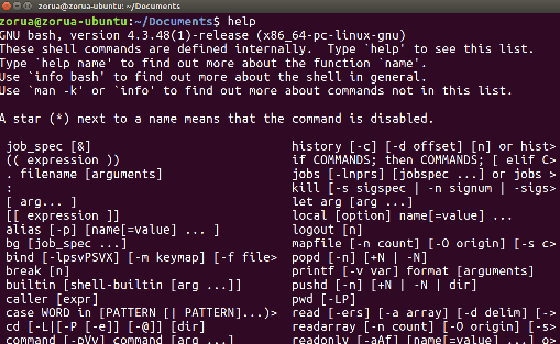 help然后按下回车键,会在终端中显示Bash的版本信息,和一些指令。