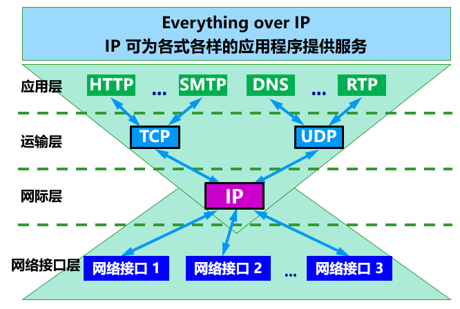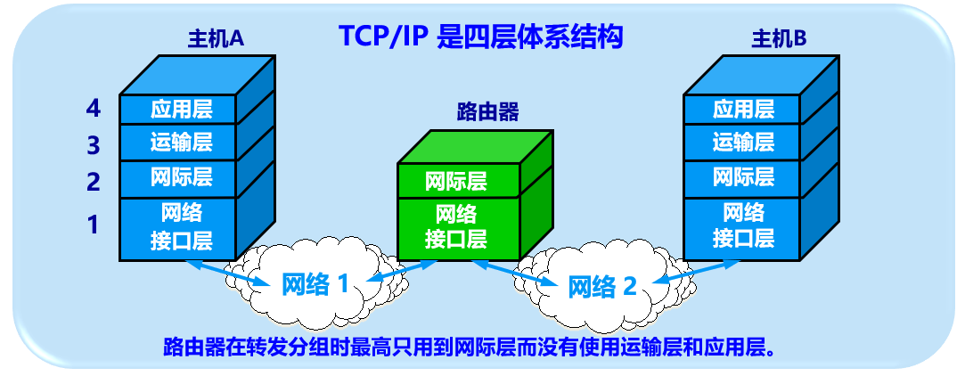 - TCP/IP 是四层体系结构:应用层、运输层、网际层和网络接口层。