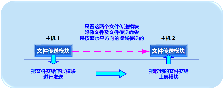 - 两个主机将文件传送模块作为最高的一层 ,剩下的工作由下面的模块负责。