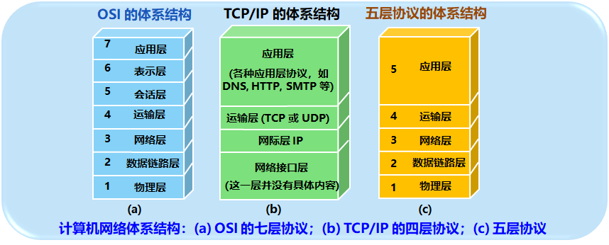 - 因此往往采取折中的办法,即综合 OSI 和 TCP/IP 的优点,采用一种只有五层协议的体系结构。