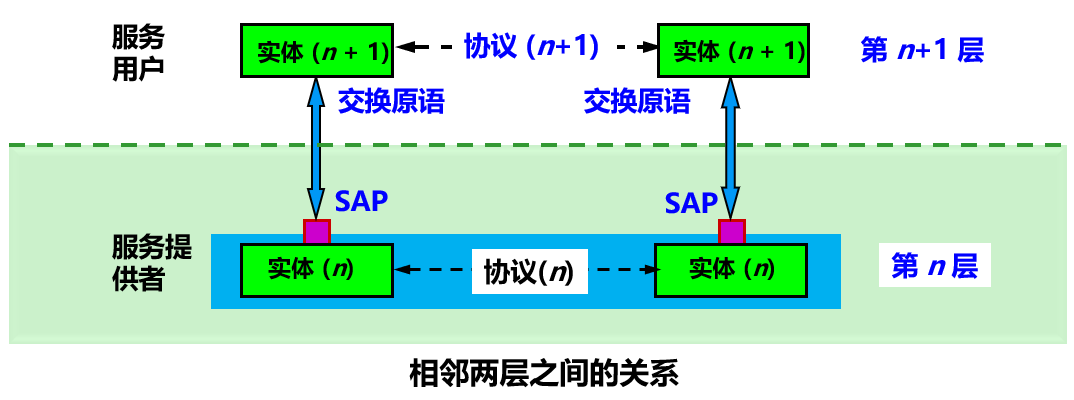 - 在协议的控制下,两个对等实体间的通信使得本层能够向上一层提供服务。