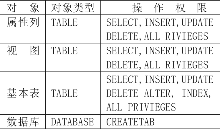 - 用户对自己建立的基本表和视图拥有全部的操作权限,并且可以用GRANT语句把其中某些权限授予其他用户。