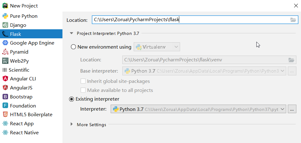 在Pycharm中点击新建,选择Flask项目,即可完成项目的创建。