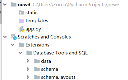 项目创建完毕后,可以看到如下的文件夹结构。Flask框架确实比Django框架要轻量得多。