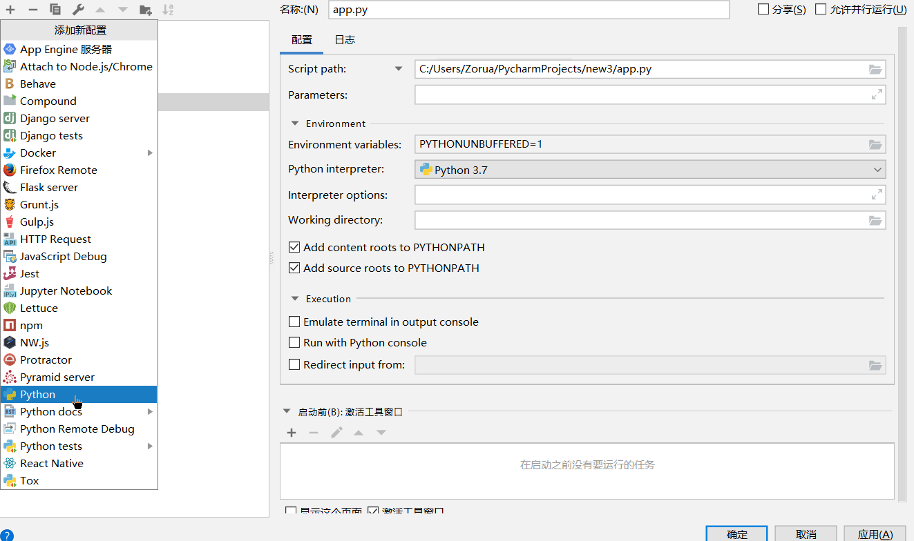 选择Python,然后在右侧,名称写为app.py,Script Path为该文件的绝对路径。