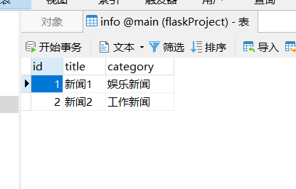 | info1 = Info(id=1,title='新闻1',category='娱乐新闻') info2 = Info(id=2,title='新闻2',category='工作新闻') db.session.add_all([info1,info2]) db.session.commit()