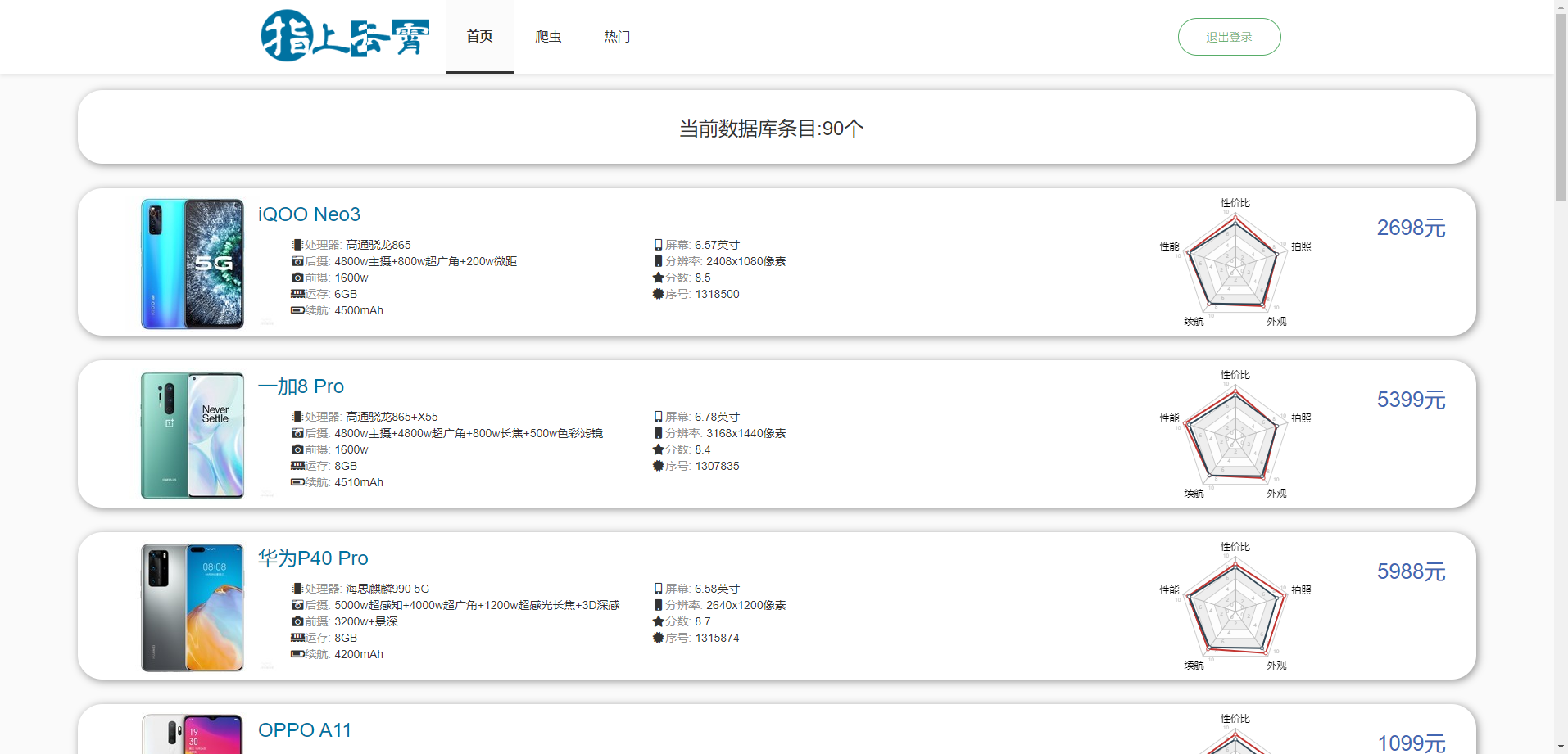 - 爬虫:可以在页面上调用后台接口,爬取ZOL手机报价网站上的数据并存储到数据库中。