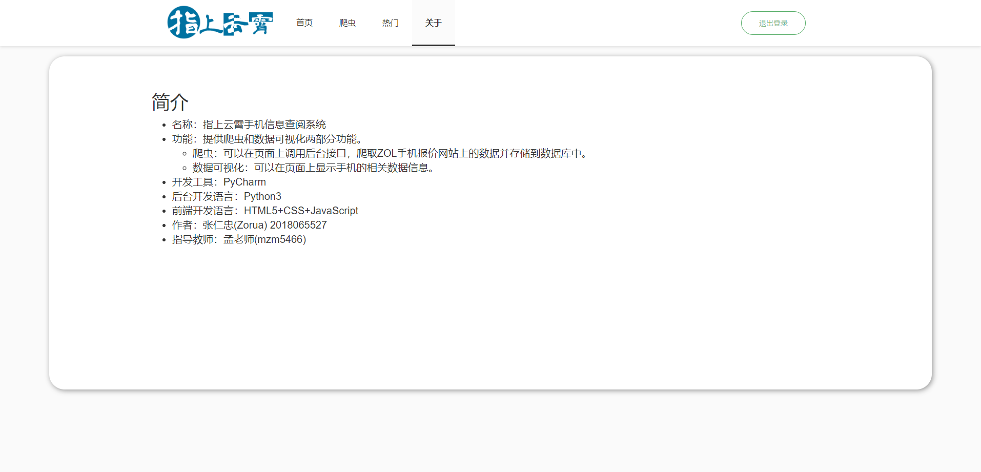 应用的页面有登录注册页面、数据可视化首页、爬虫页面、数据柱状图页面、关于页面五个页面。