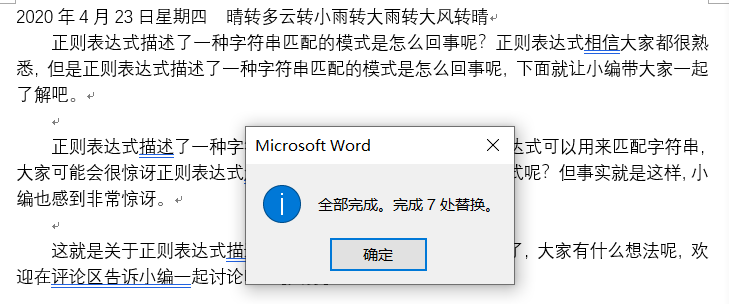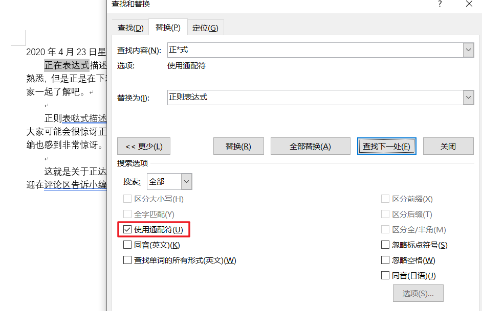 于是我果断地按下了 Ctrl H,勾选了使用通配符。由于第一个字和最后一个字是正确的,因此查找的内容只需为正*式即可检索到所有错误的正则表达式文本。然后点击全部替换。便轻松愉快地全部修正了。