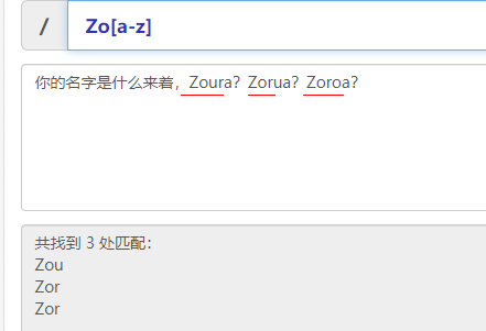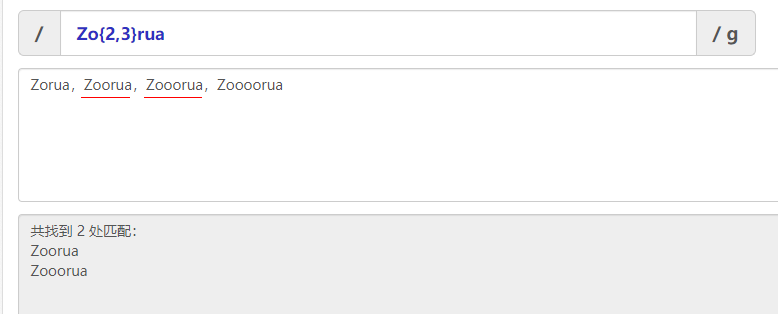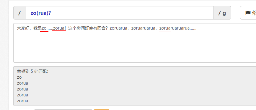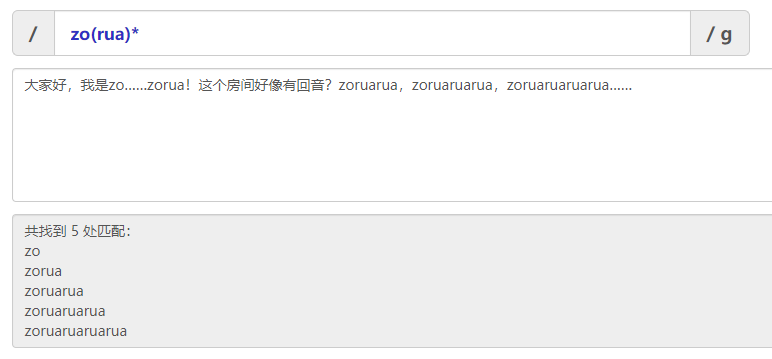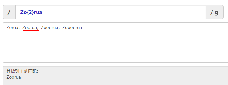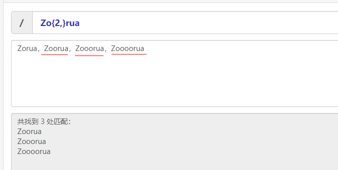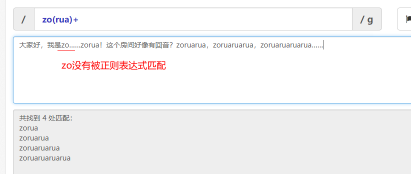 zo(rua)+能够匹配zorua,zoruarua,zoruaruarua等等。但是不能匹配zo。