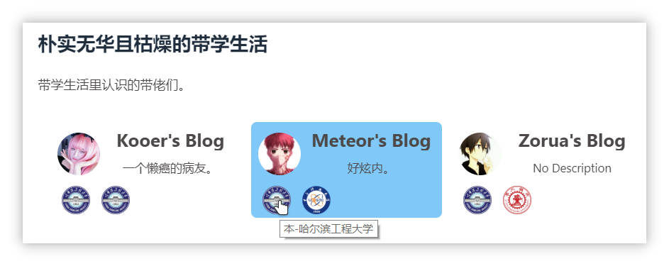 最近这段时间,我在我的博客的友情链接功能中完成了新的特性。就像下面这幅图一样,可以在卡片上显示院校校徽。