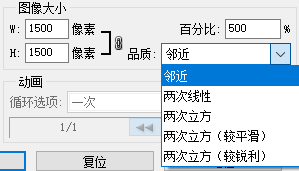 所以同样是放大5倍,画图工具和贴图工具产生的最终结果不一样。因为可以选择的插值算法有很多种。如下图所示是Photoshop中的插值算法。