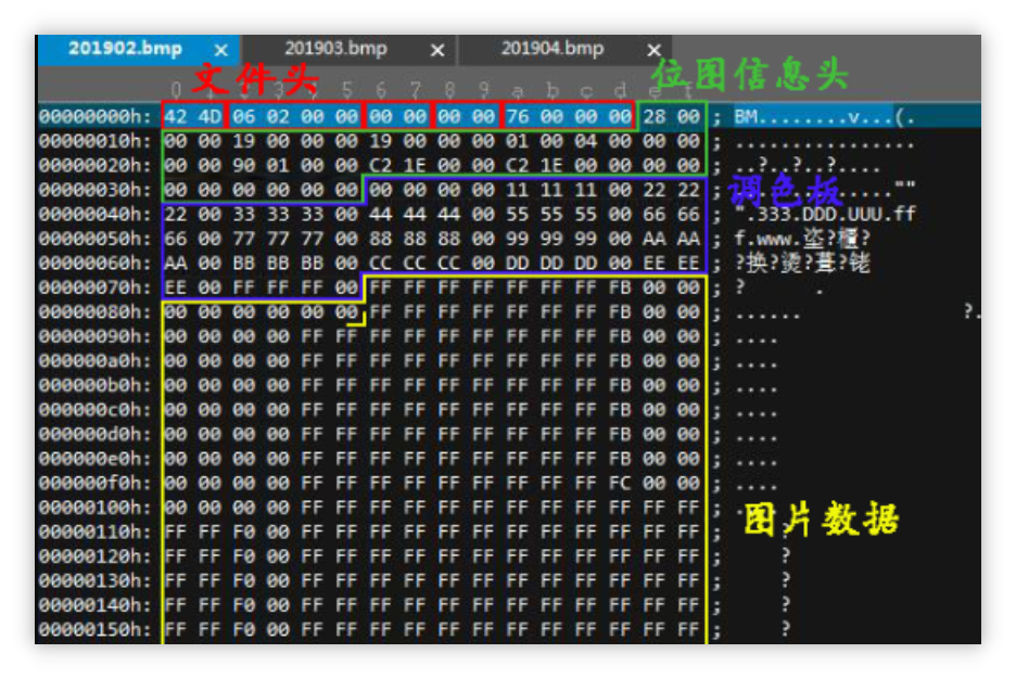我想,图像处理的本质仍然是数字处理。虽然库函数里读入图像、写到图像就像一个黑盒一样,使用者不必关心其内部如何,但是我大概能摸索出它的内部实现或许是根据文件的编码格式来读取二进制数据放到内存的不同数据结构中(如下图是BMP图像的文件格式,详情可以查看这篇文章);
