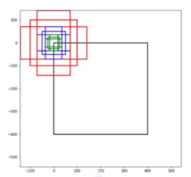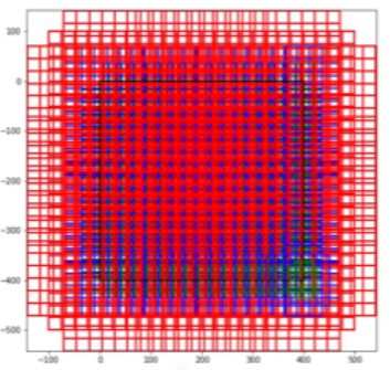 图中红色、蓝色和绿色代表三种Anchor,它们的大小不同。每种Anchor又分成了长宽比为1:2、1:1、2:1的三个Anchor。