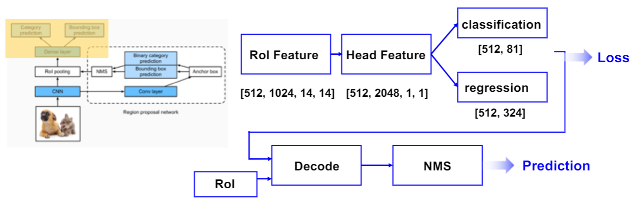 - RoI Feature 经过 Pooling 将特征图从14x14压缩到1x1;然后这个特征经过两个FC作为分类分支和回归分支的预测。最后再去计算 loss 。