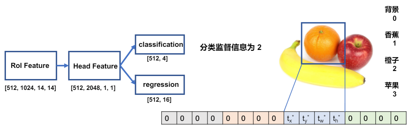 - 回归分支学习每个 RoI 到真实框的偏移量