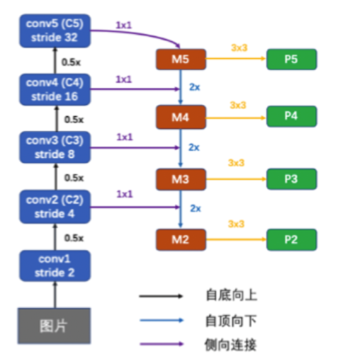 输入为骨干网络每一层的输出;将特征进行上采样,再与上一层特征相加得到 FPN 结构每一层的输出, FPN 结构和骨干网络是相互独立的。