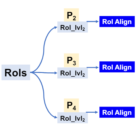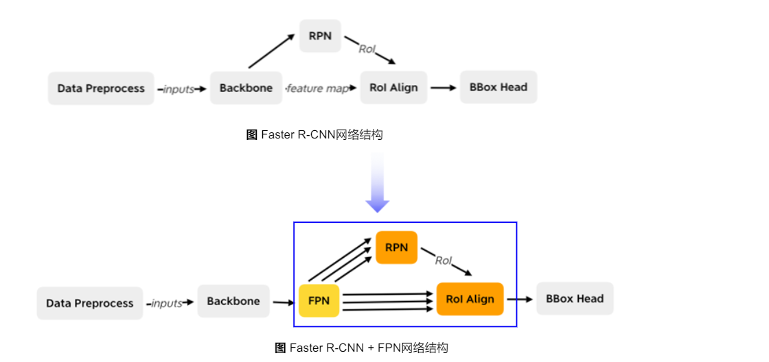 在骨干网络之后增加FPN网络,此时输出的是多个特征图,RPN模块和RoI Align模块会受到影响,第二阶段BBox head不变。