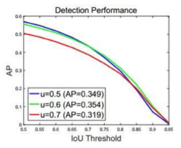- 线条:使用不同IoU阈值筛选出候选框训练出来的模型。